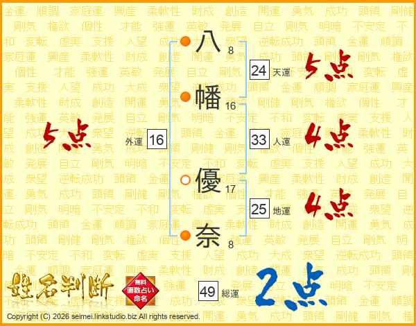 生活面を象徴する運勢です。外部から受ける影響力を表し、結婚運、家庭運や職場、環境への順応性を表します。総運から人運を引いた画数。姓や名が1文字の場合を除く。
