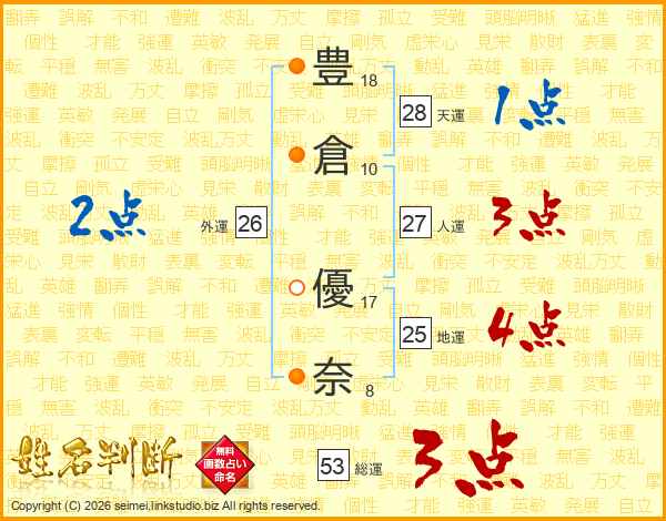 豊(18画)倉(10画) 優(17画)奈(8画)