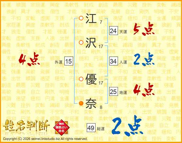 生活面を象徴する運勢です。外部から受ける影響力を表し、結婚運、家庭運や職場、環境への順応性を表します。総運から人運を引いた画数。姓や名が1文字の場合を除く。