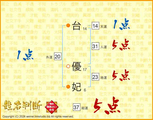 台(14画) 優(17画)妃(6画)