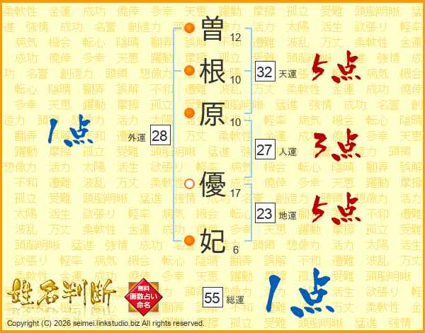 曽(12画)根(10画)原(10画) 優(17画)妃(6画)