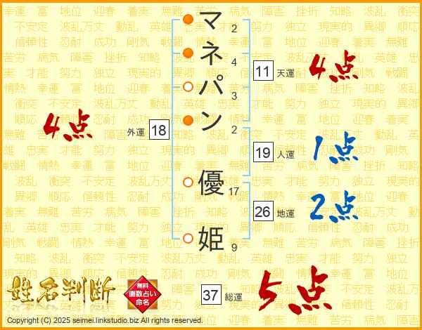 マ(2画)ネ(4画)パ(3画)ン(2画) 優(17画)姫(9画)