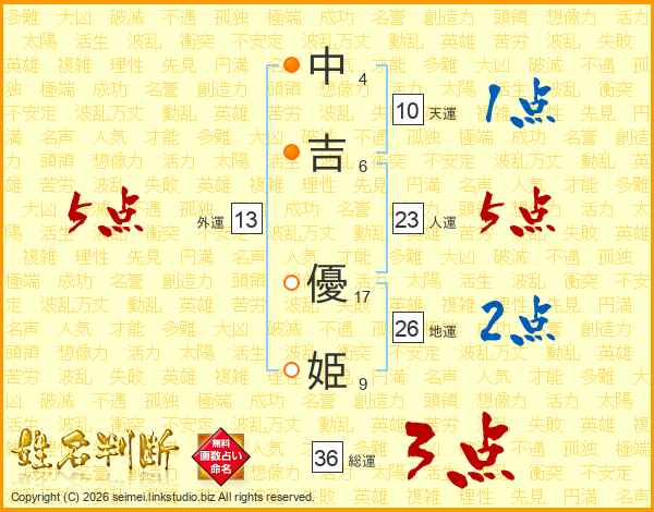 中吉優姫さんの総運は36画の3点!