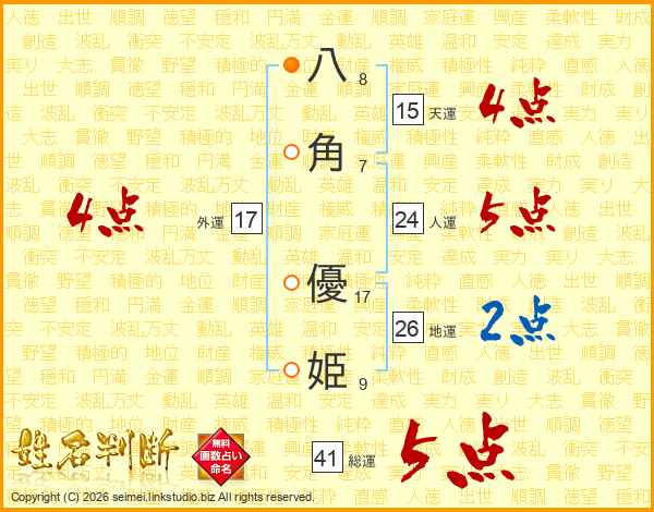八(8画)角(7画) 優(17画)姫(9画)
