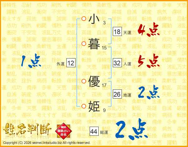小(3画)暮(15画) 優(17画)姫(9画)