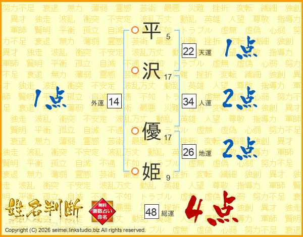 平(5画)沢(17画) 優(17画)姫(9画)