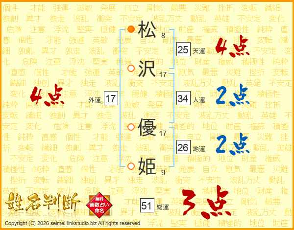 松(8画)沢(17画) 優(17画)姫(9画)