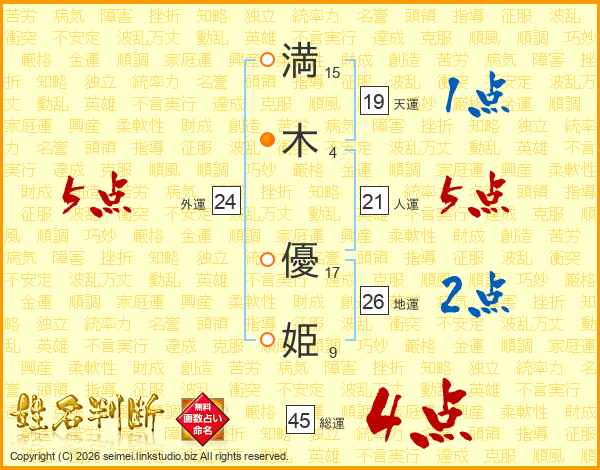 あなたの人生を表す1番重要な運勢です。生涯を通じて影響する総合運となり、主に50歳以降の晩年期に影響を及ぼします。苗字と名前の合計画数。