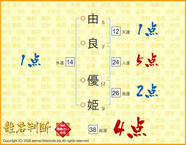 由(5画)良(7画) 優(17画)姫(9画)