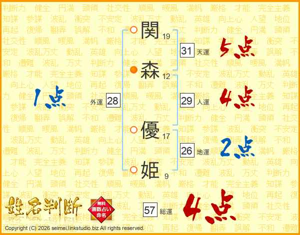 関(19画)森(12画) 優(17画)姫(9画)