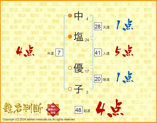 生活面を象徴する運勢です。外部から受ける影響力を表し、結婚運、家庭運や職場、環境への順応性を表します。総運から人運を引いた画数。姓や名が1文字の場合を除く。