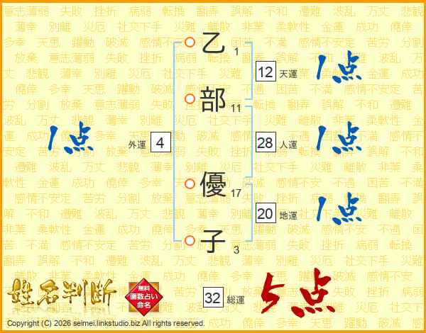 画数の奇数(○陽)と偶数(●陰)の配列で吉凶を占います。どちらかにかたよる名前は大凶名で避ける必要があります。画数の奇数偶数。