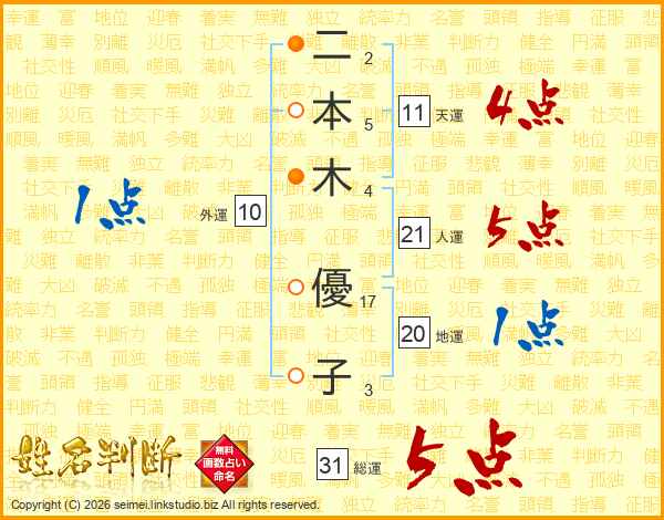 二(2画)本(5画)木(4画) 優(17画)子(3画)