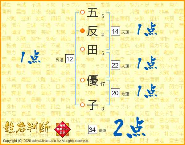 五(5画)反(4画)田(5画) 優(17画)子(3画)