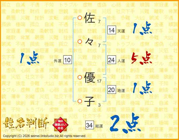 生活面を象徴する運勢です。外部から受ける影響力を表し、結婚運、家庭運や職場、環境への順応性を表します。総運から人運を引いた画数。姓や名が1文字の場合を除く。
