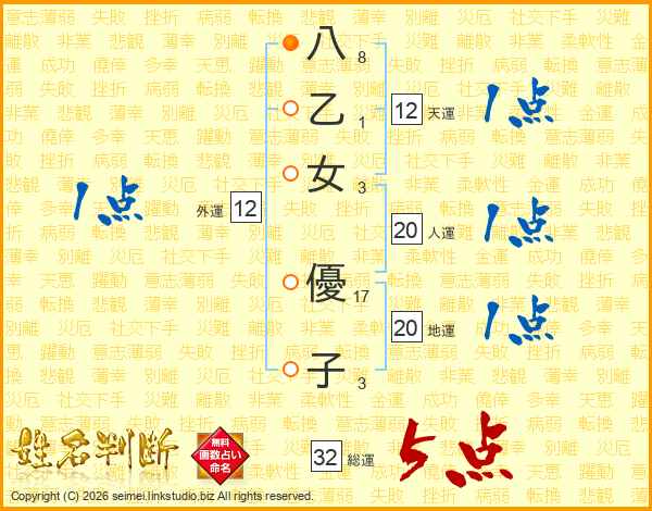八乙女優子さんの総運は32画の5点!