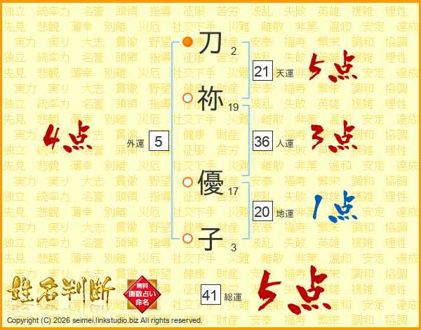 刀祢優子さんの総運は41画の5点!