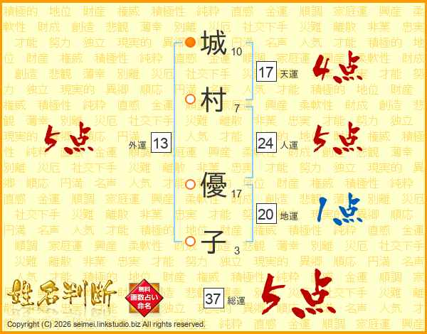 城村優子さんの総運は37画の5点!