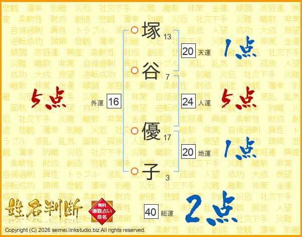 塚(13画)谷(7画) 優(17画)子(3画)