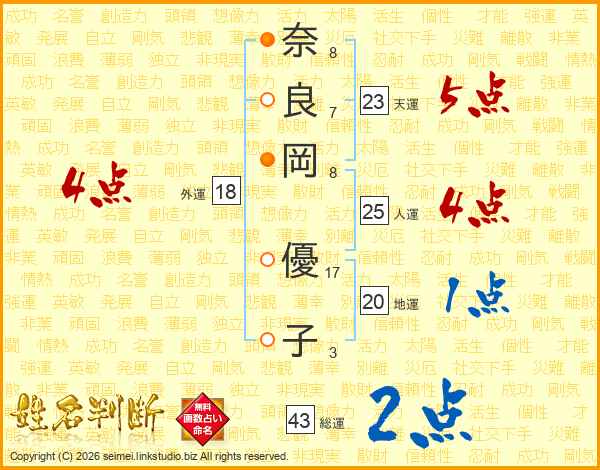 奈(8画)良(7画)岡(8画) 優(17画)子(3画)