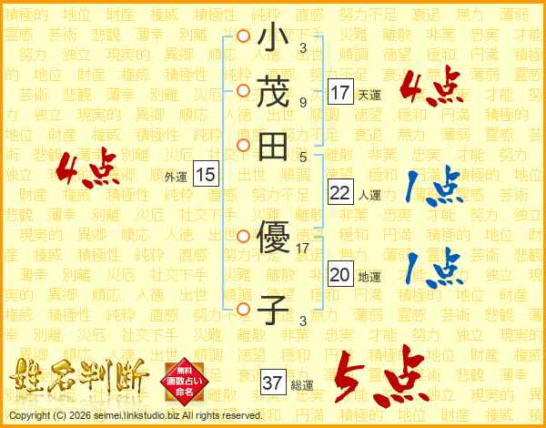小(3画)茂(9画)田(5画) 優(17画)子(3画)