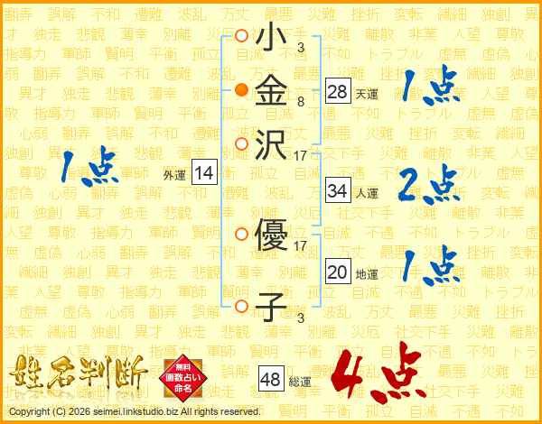 小(3画)金(8画)沢(17画) 優(17画)子(3画)
