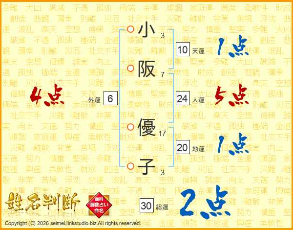 小阪優子さんの総運は30画の2点!