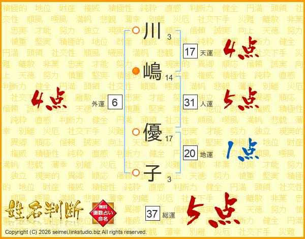 川(3画)嶋(14画) 優(17画)子(3画)