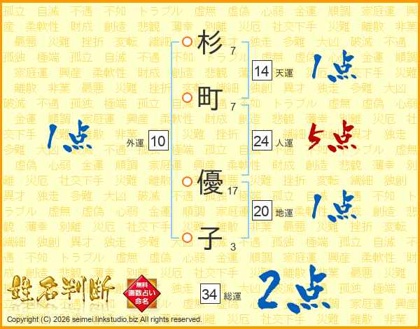 杉(7画)町(7画) 優(17画)子(3画)