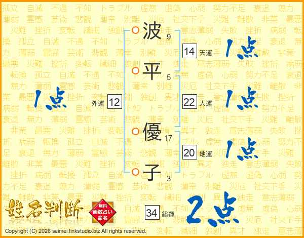波(9画)平(5画) 優(17画)子(3画)