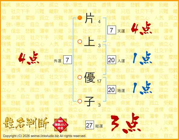 生活面を象徴する運勢です。外部から受ける影響力を表し、結婚運、家庭運や職場、環境への順応性を表します。総運から人運を引いた画数。姓や名が1文字の場合を除く。