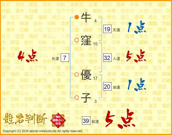 牛(4画)窪(15画) 優(17画)子(3画)
