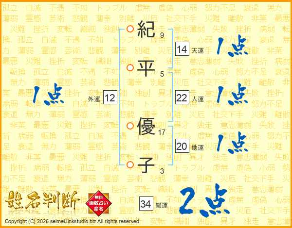 生活面を象徴する運勢です。外部から受ける影響力を表し、結婚運、家庭運や職場、環境への順応性を表します。総運から人運を引いた画数。姓や名が1文字の場合を除く。