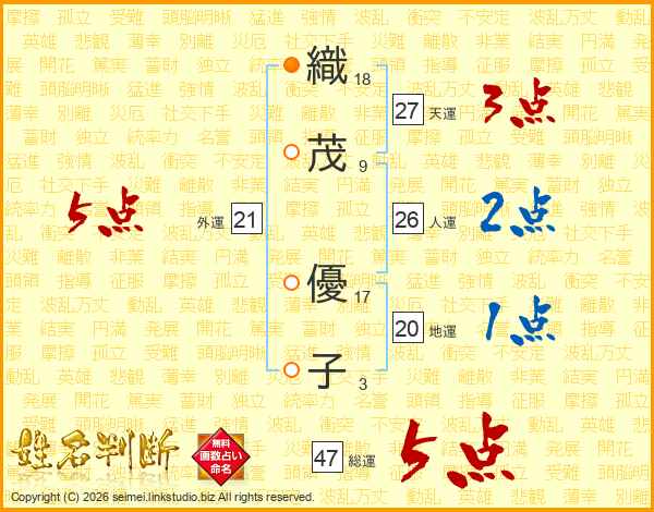 織(18画)茂(9画) 優(17画)子(3画)