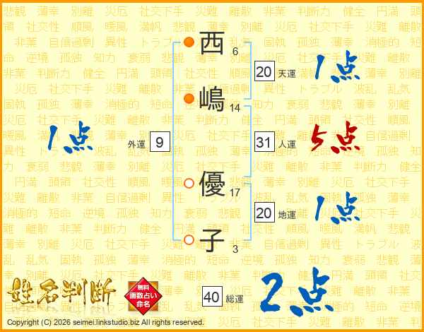 西(6画)嶋(14画) 優(17画)子(3画)