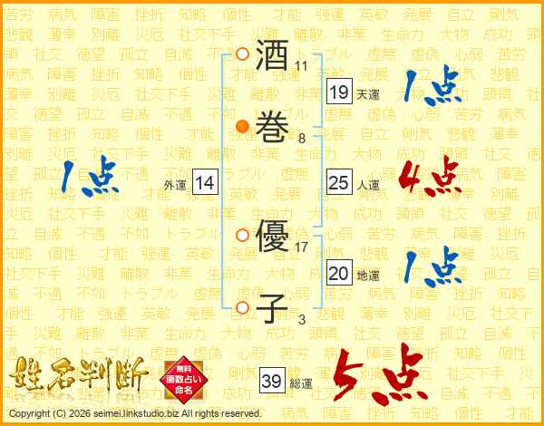 あなたの人生を表す1番重要な運勢です。生涯を通じて影響する総合運となり、主に50歳以降の晩年期に影響を及ぼします。苗字と名前の合計画数。