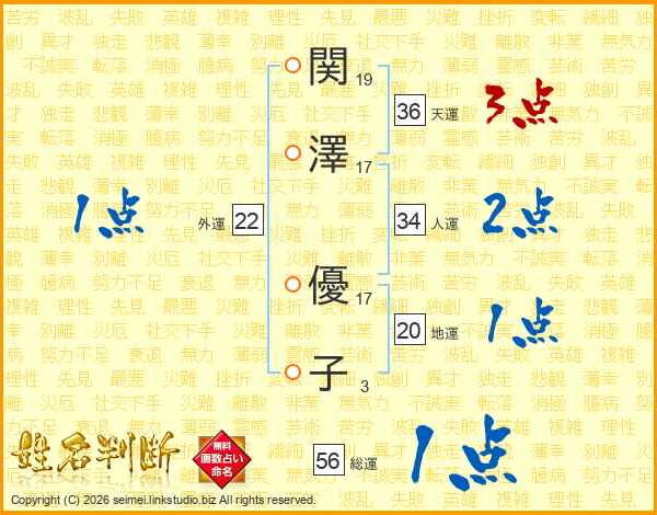 生活面を象徴する運勢です。外部から受ける影響力を表し、結婚運、家庭運や職場、環境への順応性を表します。総運から人運を引いた画数。姓や名が1文字の場合を除く。