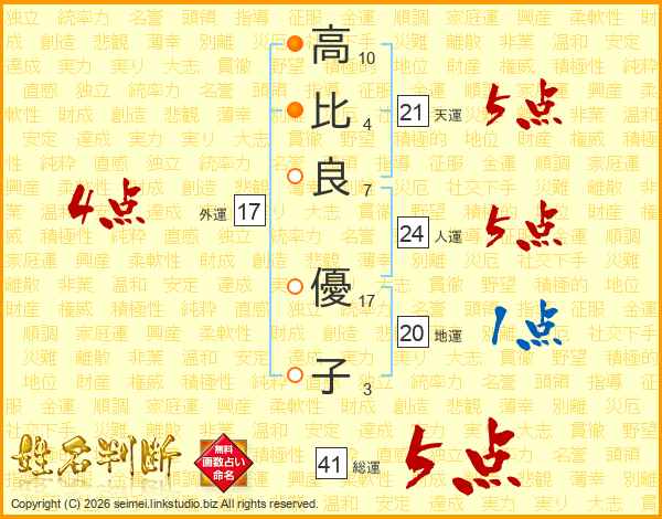 高(10画)比(4画)良(7画) 優(17画)子(3画)