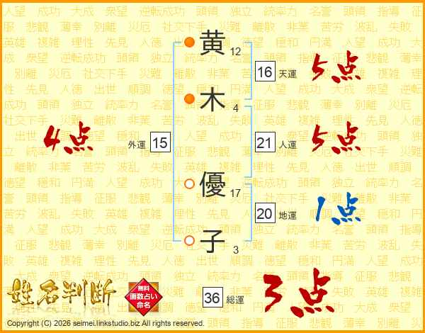 黄(12画)木(4画) 優(17画)子(3画)