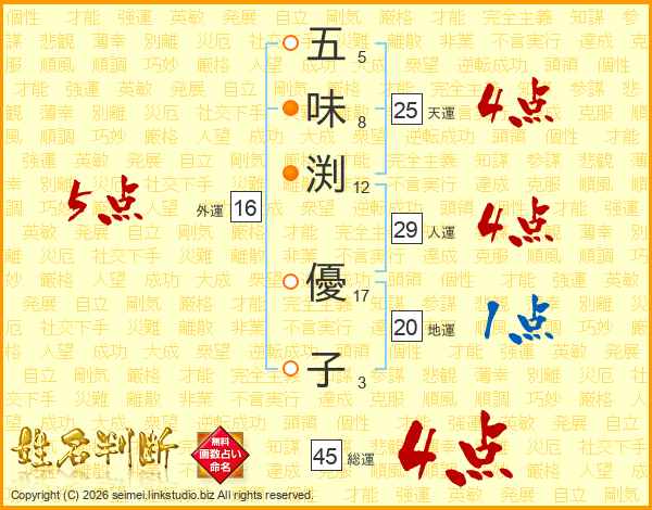 五(5画)味(8画)渕(12画) 優(17画)子(3画)