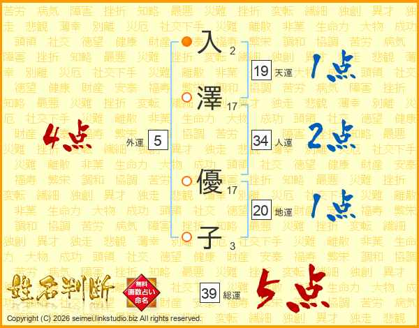 入(2画)澤(17画) 優(17画)子(3画)