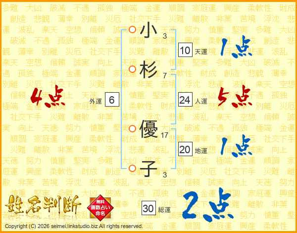 小(3画)杉(7画) 優(17画)子(3画)