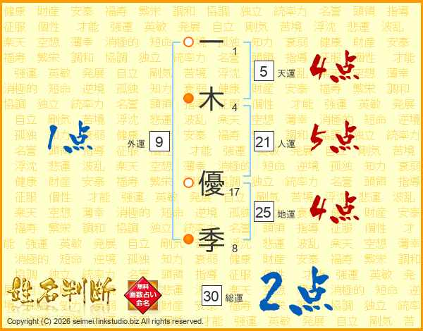 一(1画)木(4画) 優(17画)季(8画)