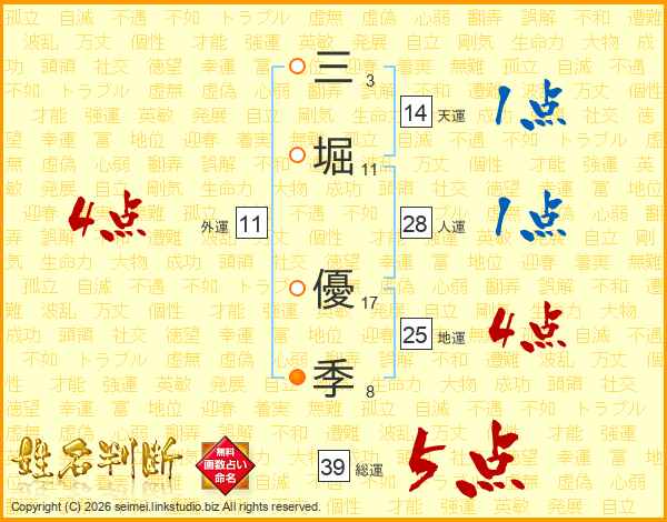 三(3画)堀(11画) 優(17画)季(8画)
