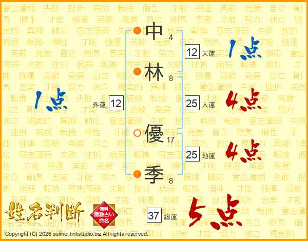 あなたの人生を表す1番重要な運勢です。生涯を通じて影響する総合運となり、主に50歳以降の晩年期に影響を及ぼします。苗字と名前の合計画数。