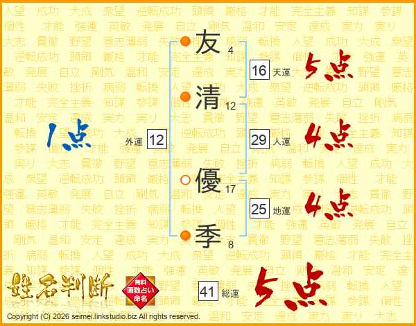 友(4画)清(12画) 優(17画)季(8画)