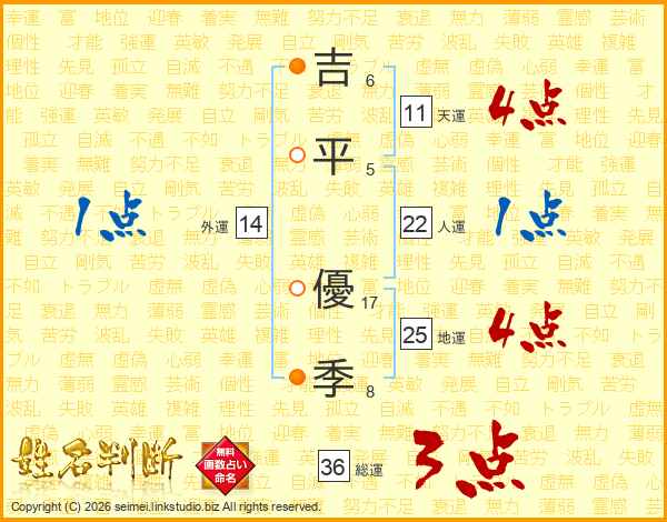 吉(6画)平(5画) 優(17画)季(8画)