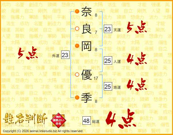 奈(8画)良(7画)岡(8画) 優(17画)季(8画)