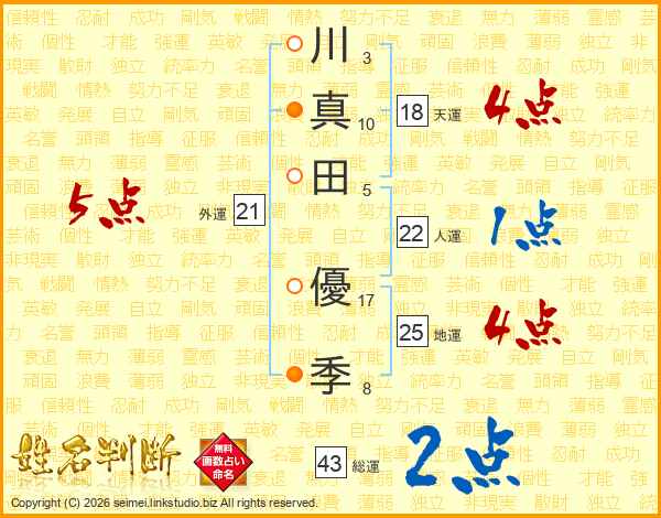 川(3画)真(10画)田(5画) 優(17画)季(8画)