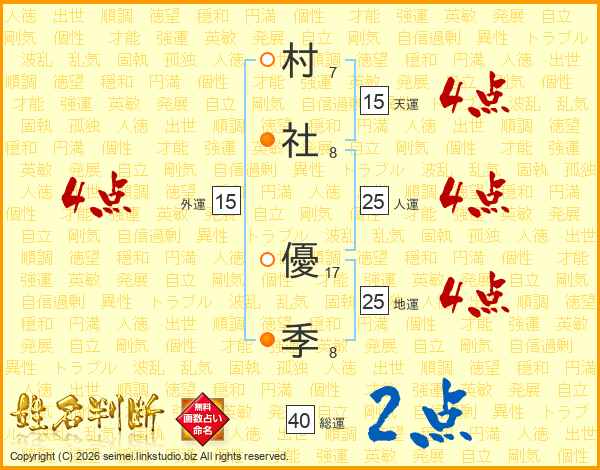 村(7画)社(8画) 優(17画)季(8画)